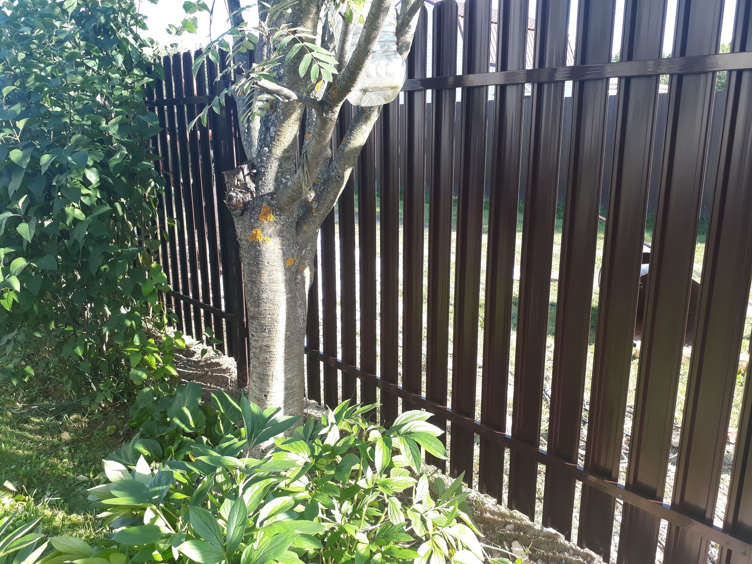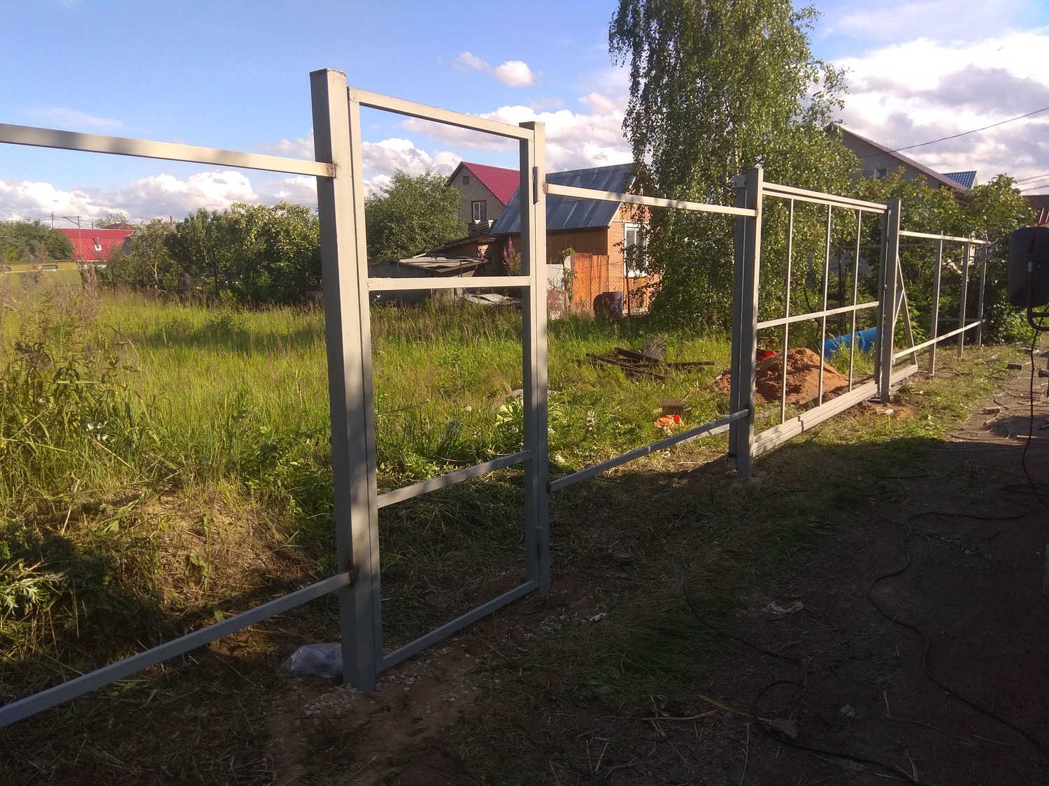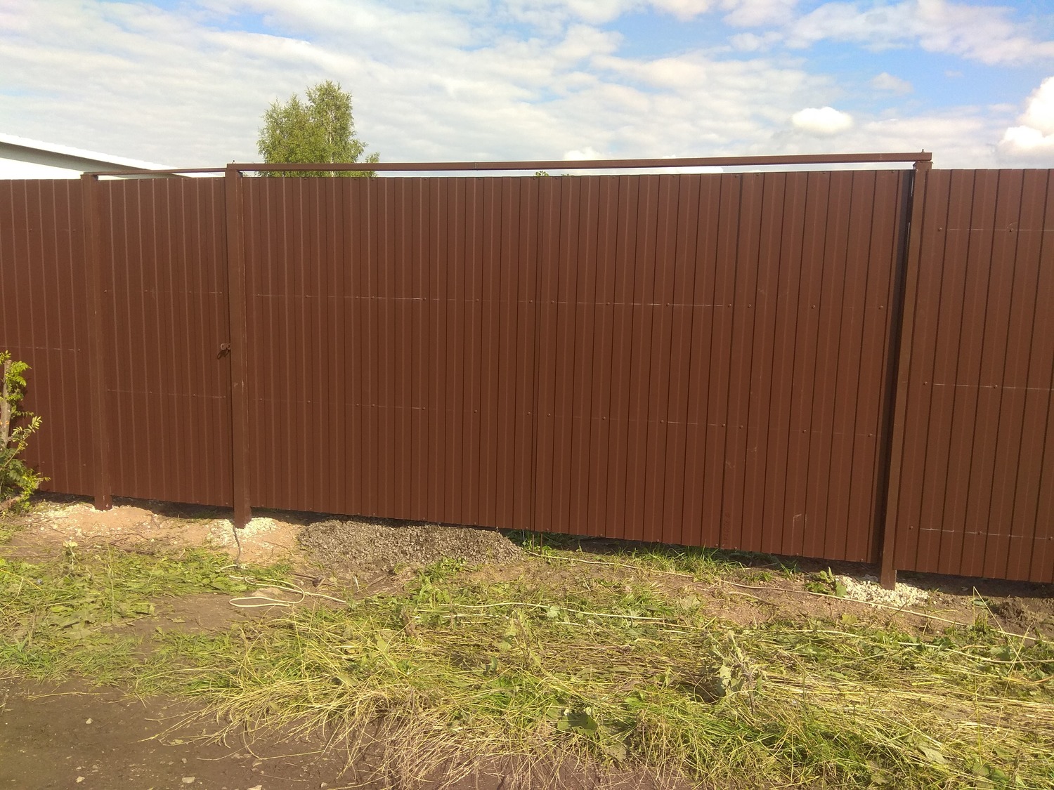 - Материал: Профнастил, металлический штакетник, сетка, проф труба, дерево
